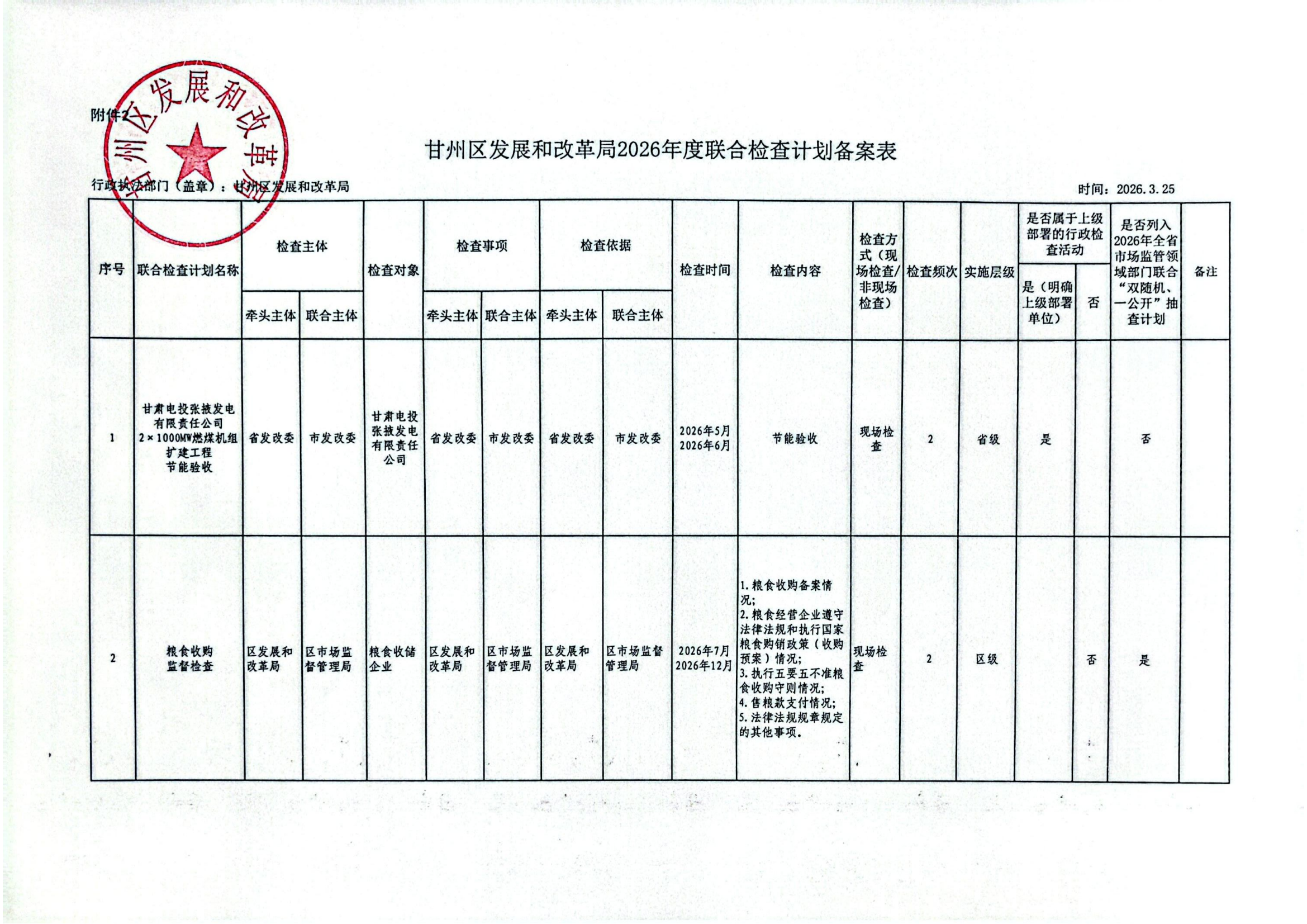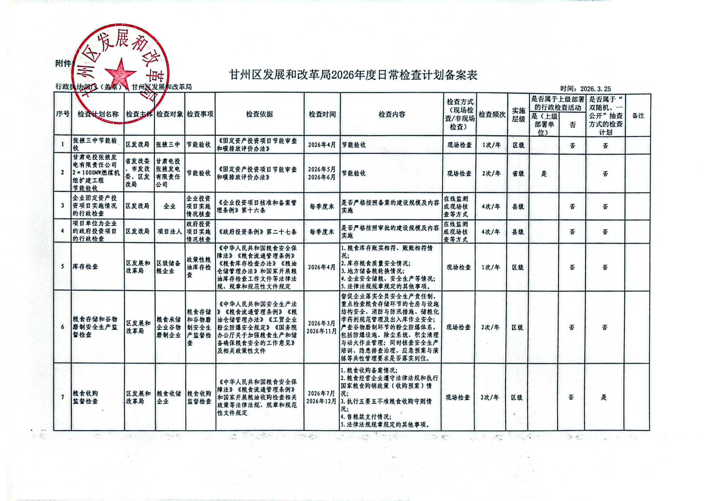甘州区发展和改革局2026年度日常检查计划备案表